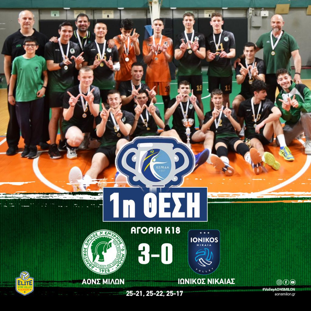 Στον Κυριακάτικο τελικό του Final-4 της ΕΣΠΕΔΑ που έγινε στο κατάμεστο κλειστό «Κροίσος Πέρσης», η ομάδα βόλει του Μίλωνα (Αγόρια Κ18) αναδείχτηκε πρωταθλήτρια για την περίοδο 2022-2023 επικρατώντας της ομάδας του Ιωνικού Νίκαιας με 3-0 σετ, σε μια δυνατή αναμέτρηση που κράτησε αμείωτο το ενδιαφέρον των φιλάθλων που την παρακολούθησαν.