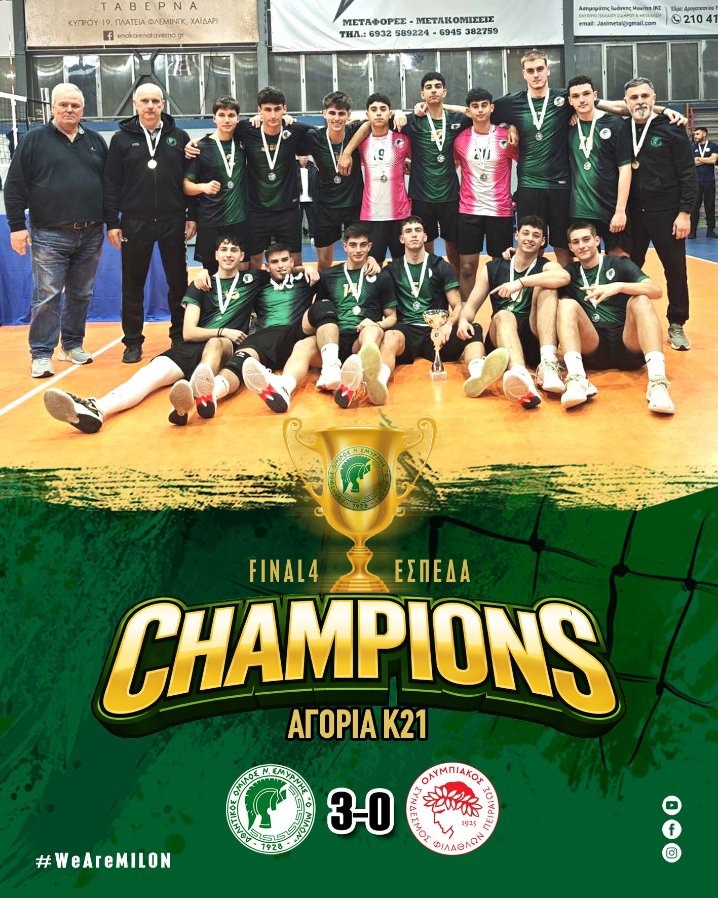 Μεγάλη επιτυχία για τα Αγόρια Κ21 του Α.Ο.Ν.Σ. Μίλων, που κατέκτησαν πανάξια τον τίτλο, ολοκληρώνοντας το Final 4 με δύο καθαρές νίκες και εντυπωσιακές εμφανίσεις.