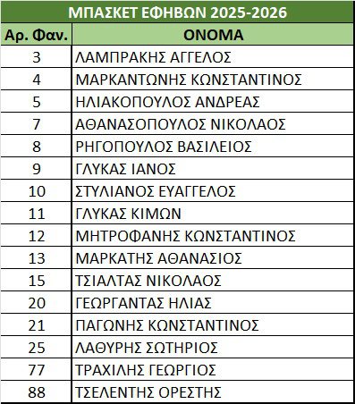 Ρόστερ Μπάσκετ Εφήβων 2025-2026