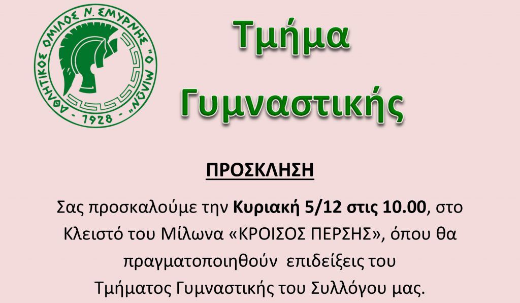 Σας προσκαλούμε την Κυριακή 5/12 στις 10.00, στο Κλειστό του Μίλωνα «ΚΡΟΙΣΟΣ ΠΕΡΣΗΣ», όπου θα πραγματοποιηθούν  επιδείξεις του Τμήματος Γυμναστικής του Συλλόγου μας.