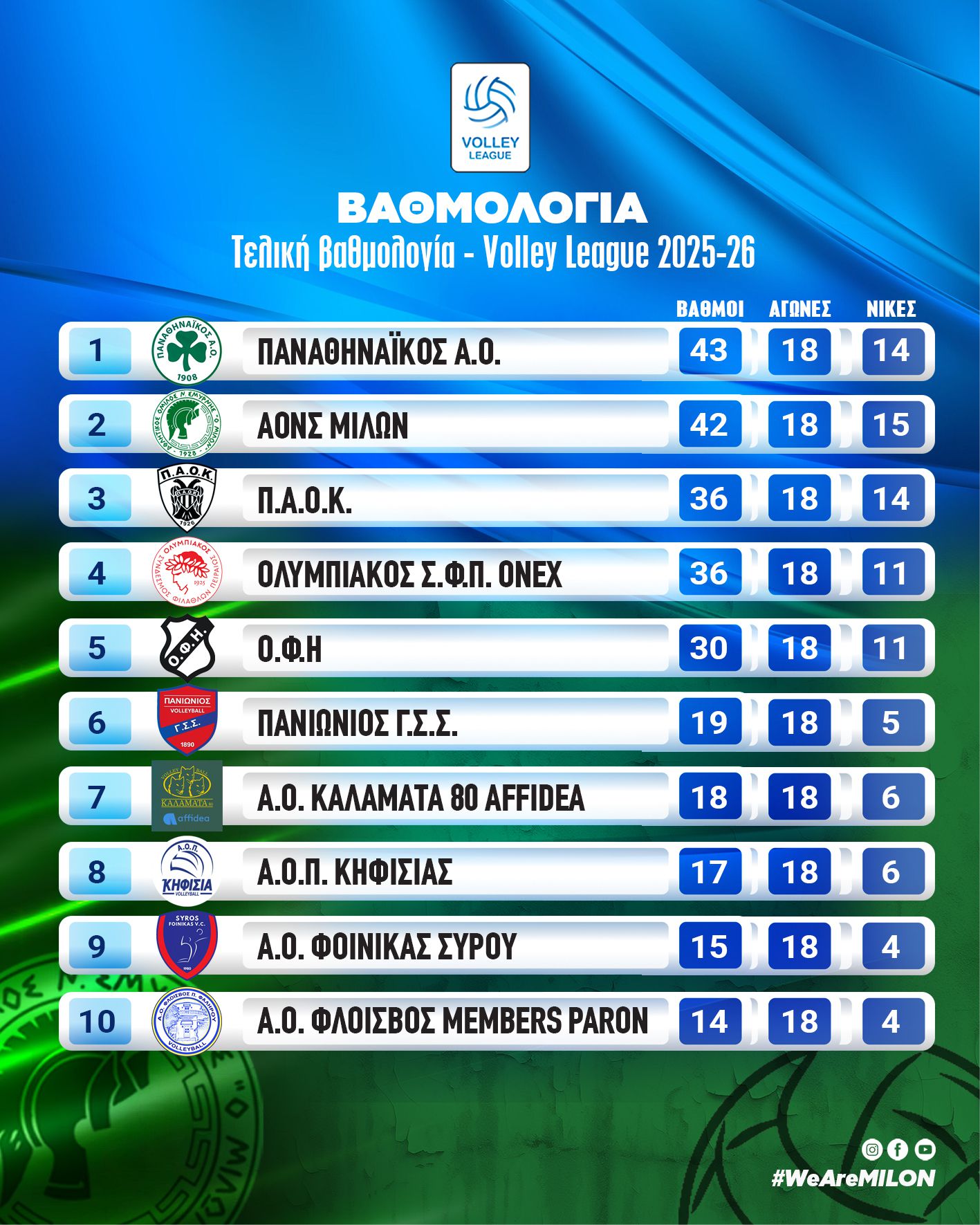 Ο Α.Ο.Ν.Σ. Μίλων ολοκλήρωσε την κανονική περίοδο της Volley League στη 2η θέση με 42 βαθμούς, μόλις έναν βαθμό πίσω από τον πρωτοπόρο Παναθηναϊκό, πετυχαίνοντας το καλύτερο πλασάρισμα στη Volley League για την ομάδα του Σάκη Ψάρρα.