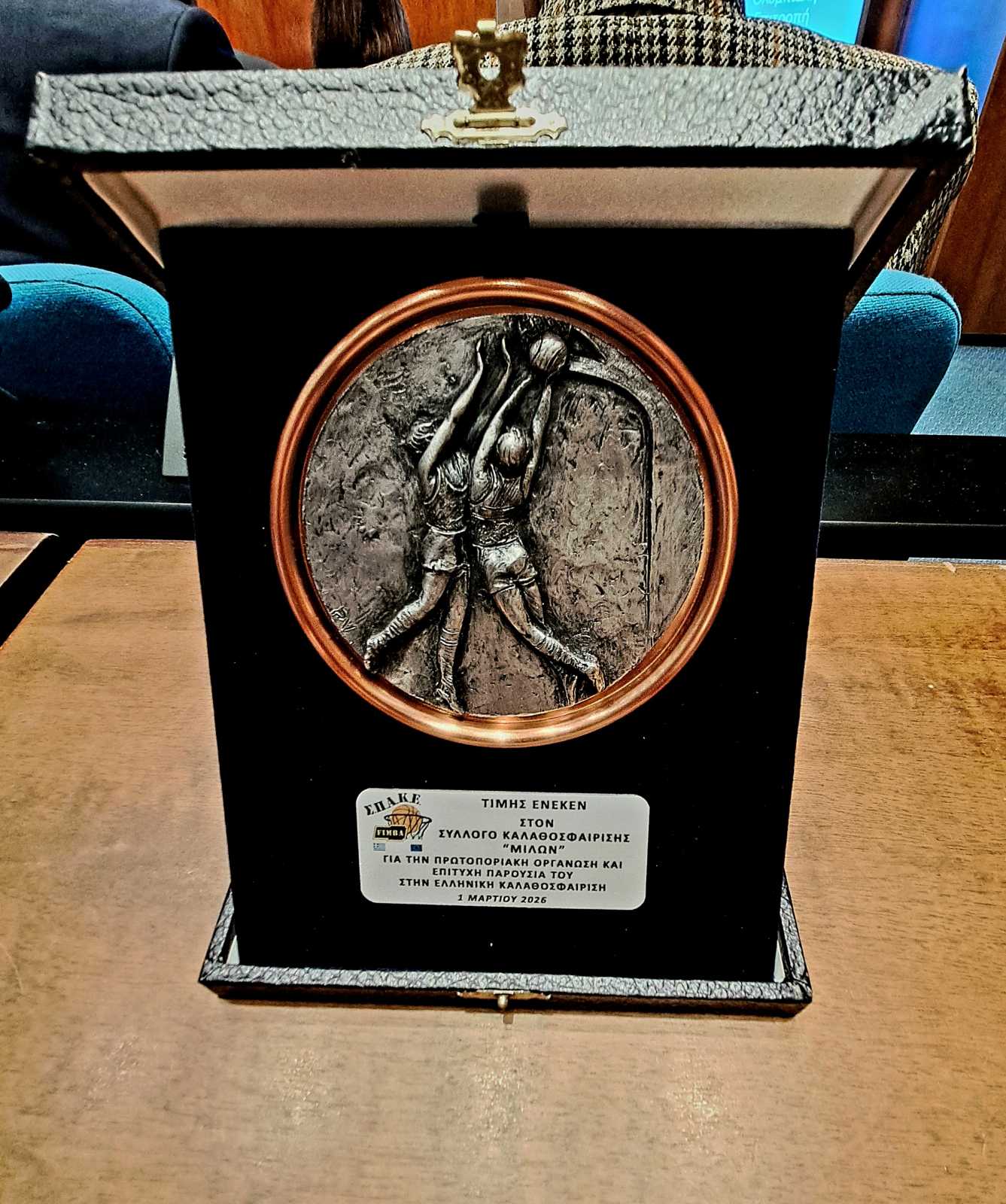 Την τιμητική πλακέτα παρέλαβαν για λογαριασμό του Μίλωνα ο Πρόεδρος του Διοικητικού μας Συμβουλίου κ. Μιχάλης Σακελλαρίδης και ο Αντιπρόεδρος και μέλος του ΣΠΑΚΕ κ. Δημήτρης Αποσκίτης.