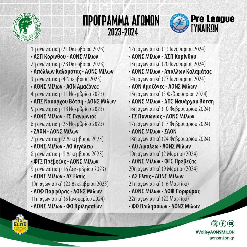 Το πρόγραμμα της γυναικείας ομάδας βόλει του Μίλωνα στην Pre League γυναικών για τη νέα αγωνιστική περίοδο (2023-2024)