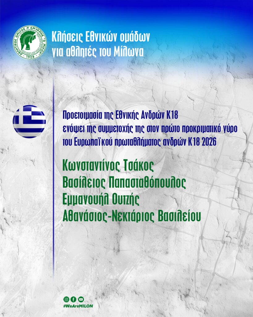 Κλήσεις αθλητών του Μίλωνα για την προετοιμασία της Εθνικής ανδρών Κ18 ενόψει της συμμετοχής της στον πρώτο προκριματικό γύρο του Ευρωπαϊκού πρωταθλήματος…