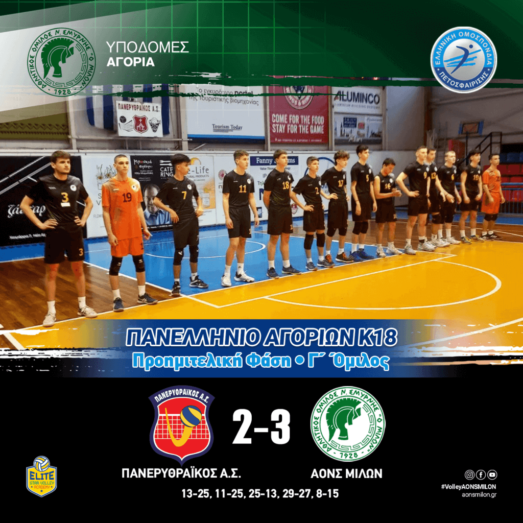 ΑΓΟΡΙΑ Κ18ΠΡΟΗΜΙΤΕΛΙΚΗ ΦΑΣΗ Γ’ ΟΜΙΛΟΣ ΠΑΝΕΡΥΘΡΑΪΚΟΣ ΑΣ ΑΟΝΣ ΜΙΛΩΝ 2 – 3 #milonvolleyball #milonvolleyballacademy #aonsmilon