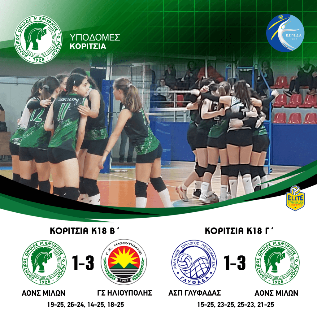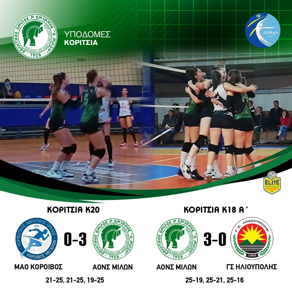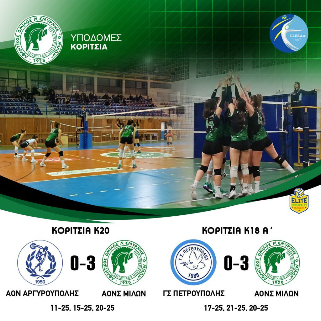 ΚΟΡΙΤΣΙΑ Κ20 ΑΟΝΣ ΜΙΛΩΝ ΓΣ ΗΛΙΟΥΠΟΛΗΣ 3 – 0 (25-13, 30-28, 25-15) ΚΟΡΙΤΣΙΑ Κ18 Γ’ ΑΟΝΣ ΜΙΛΩΝ ΑΟΦ ΠΟΡΦΥΡΑΣ 3-0 (25-15, 25-19, 25-22) #milonvolleyball…