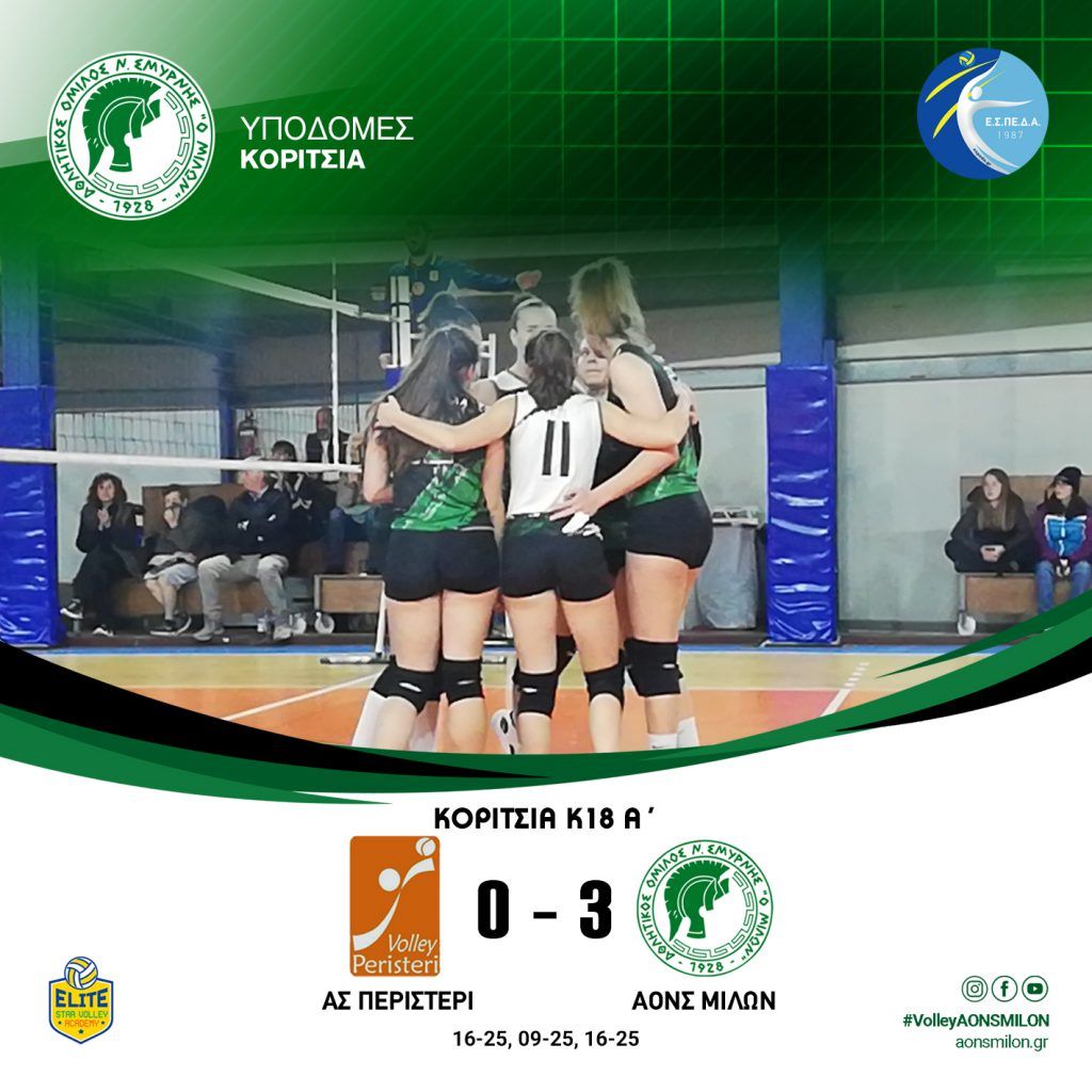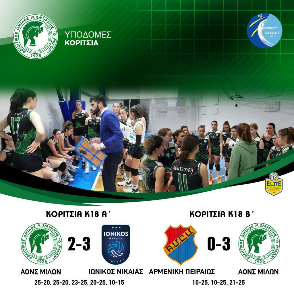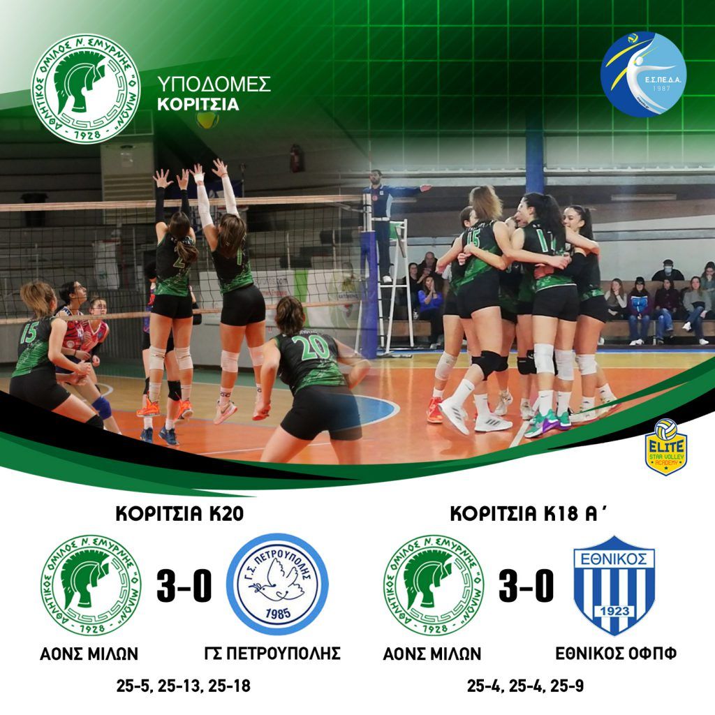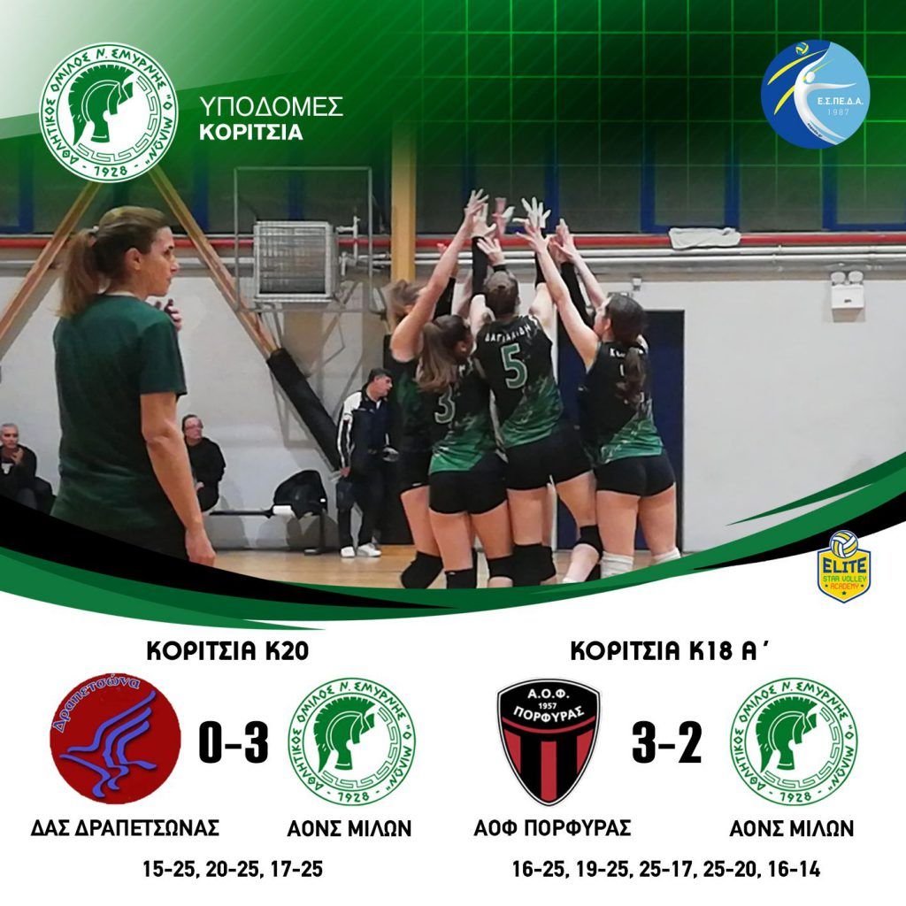 ΚΟΡΙΤΣΙΑ Κ20 ΑΟΝΣ ΜΙΛΩΝ ΓΣ ΗΛΙΟΥΠΟΛΗΣ 3 – 0 (25-13, 30-28, 25-15) ΚΟΡΙΤΣΙΑ Κ18 Γ’ ΑΟΝΣ ΜΙΛΩΝ ΑΟΦ ΠΟΡΦΥΡΑΣ 3-0 (25-15, 25-19, 25-22) #milonvolleyball…