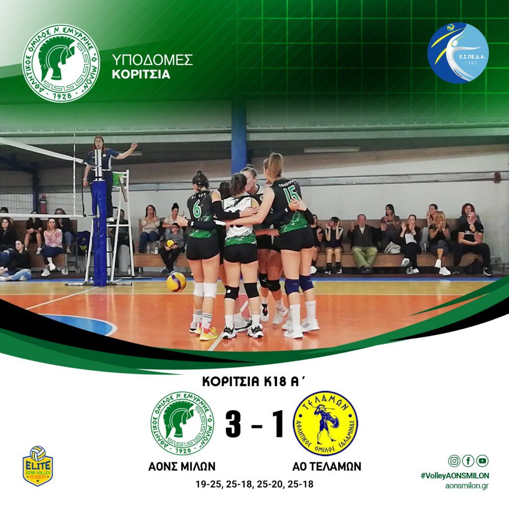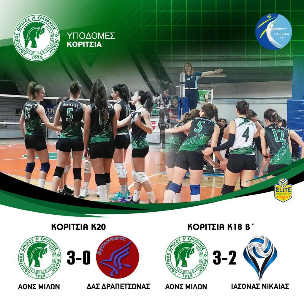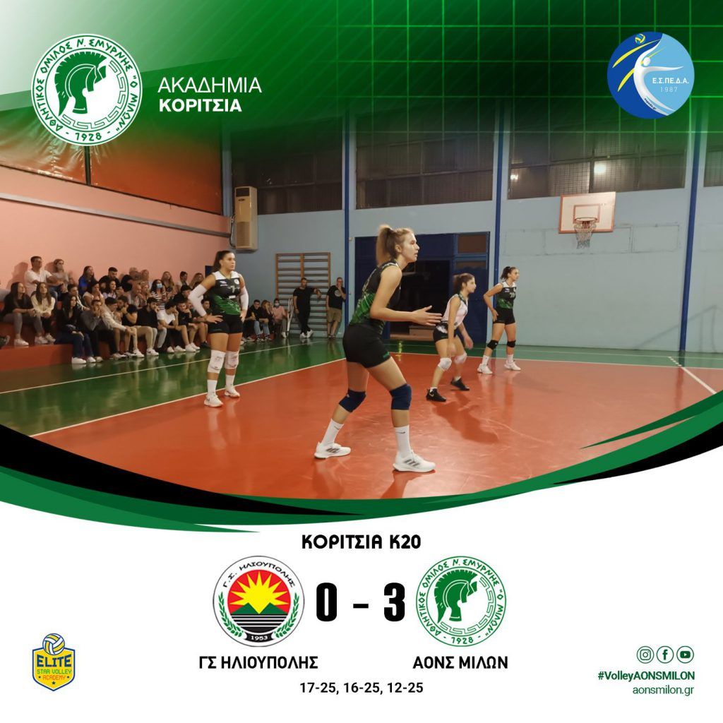 ΚΟΡΙΤΣΙΑ Κ18 Α’ ΑΟ ΑΙΓΑΛΕΩ ΑΟΝΣ ΜΙΛΩΝ 3 – 0 (25-20, 25-16, 25-20) ΚΟΡΙΤΣΙΑ Κ18 Γ’ ΟΛΥΜΠΙΑΚΟΣ ΑΟΝΣ ΜΙΛΩΝ 0-3 (11-25, 09-25, 13-25) #milonvolleyball #milonvolleyballacademy#aonsmilon
