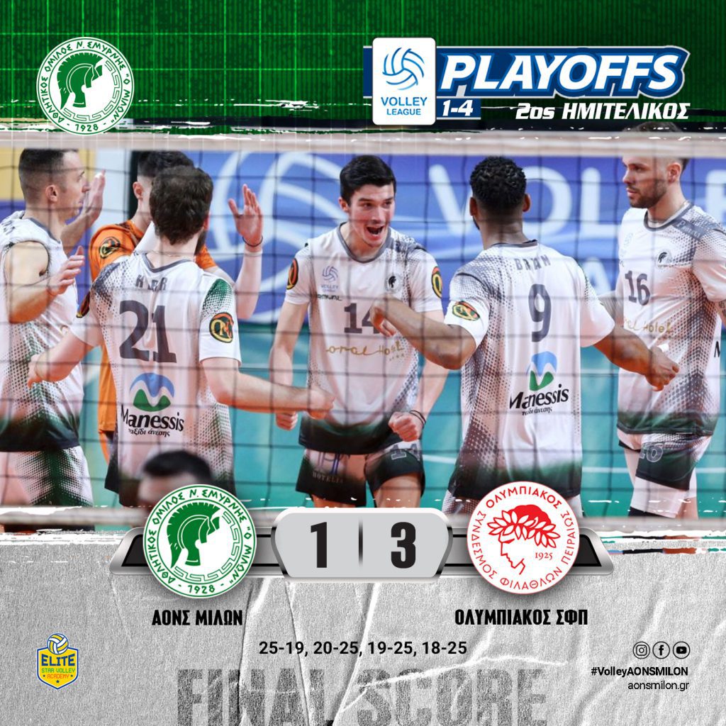 ΗΤΤΑ ΓΙΑ ΤΗΝ ΑΝΤΡΙΚΗ ΟΜΑΔΑ ΒΟΛΕΙ ΤΟΥ ΜΙΛΩΝΑ ΣΤΟ ΔΕΥΤΕΡΟ ΗΜΙΤΕΛΙΚΟ ΤΩΝ PLAY OFFS ΜΕ ΤΟΝ ΟΛΥΜΠΙΑΚΟ ΟΛΥΜΠΙΑΚΟΣ – ΜΙΛΩΝ: 1-3 ΠΡΩΤΑΘΛΗΜΑ VOLLEY LEAGUE ΑΝΔΡΩΝ