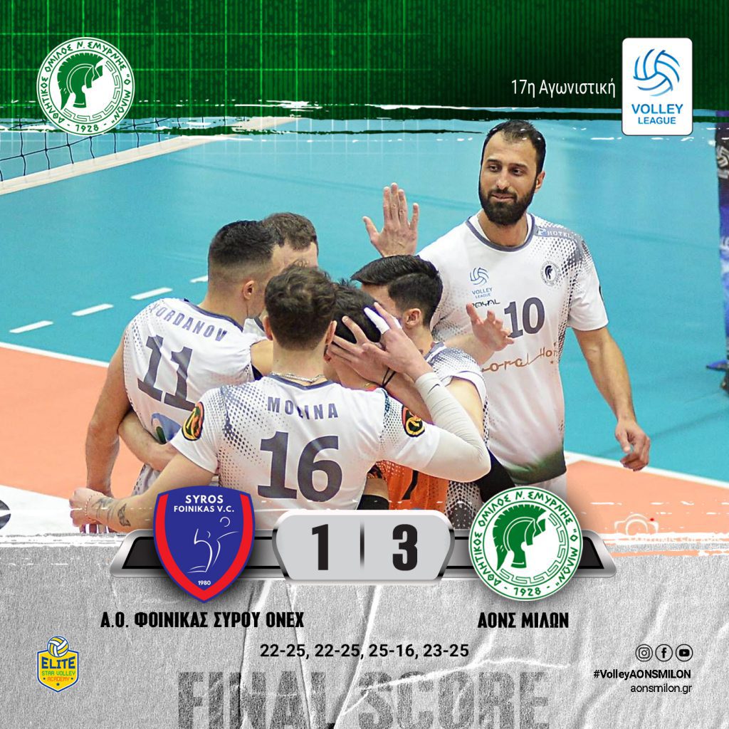 ΕΓΡΑΨΕ ΙΣΤΟΡΙΑ Η ΑΝΤΡΙΚΗ ΟΜΑΔΑ ΒΟΛΕΙ ΤΟΥ ΜΙΛΩΝΑ ΜΕ ΤΗ ΜΕΓΑΛΗ ΕΚΤΟΣ ΕΔΡΑΣ ΝΙΚΗ ΣΤΗ ΣΥΡΟ. ΦΟΙΝΙΚΑΣ ΣΥΡΟΥ – ΜΙΛΩΝ: 1-3 ΠΡΩΤΑΘΛΗΜΑ VOLLEY LEAGUE ΑΝΔΡΩΝ