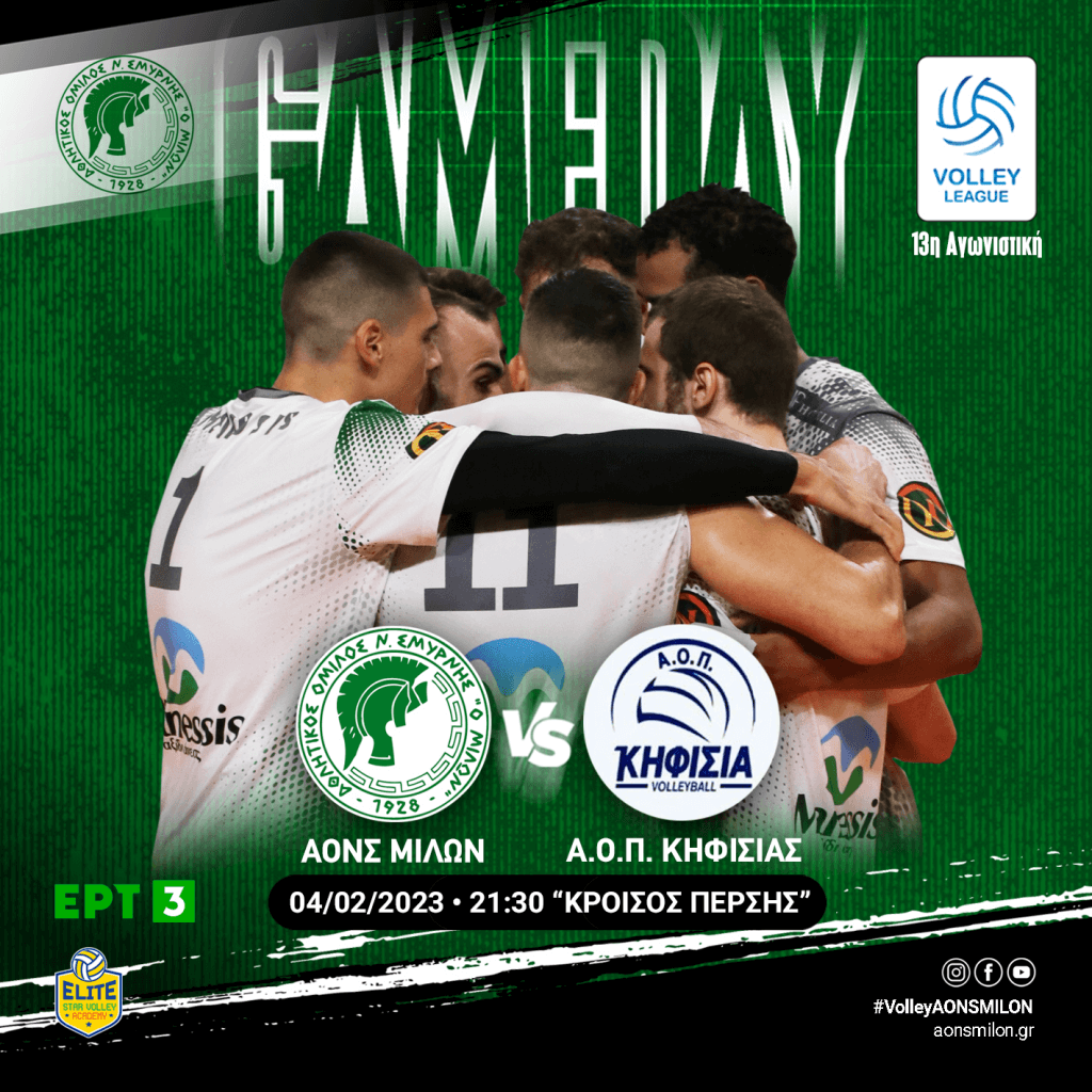 ΣΠΟΥΔΑΙΟΣ ΑΓΩΝΑΣ ΓΙΑ ΤΗΝ ΑΝΤΡΙΚΗ ΟΜΑΔΑ ΒΟΛΕΙ ΤΟΥ ΜΙΛΩΝΑ ΜΙΛΩΝ – ΚΗΦΙΣΙΑ (21:30) ΠΡΩΤΑΘΛΗΜΑ VOLLEY LEAGUE ΑΝΔΡΩΝ