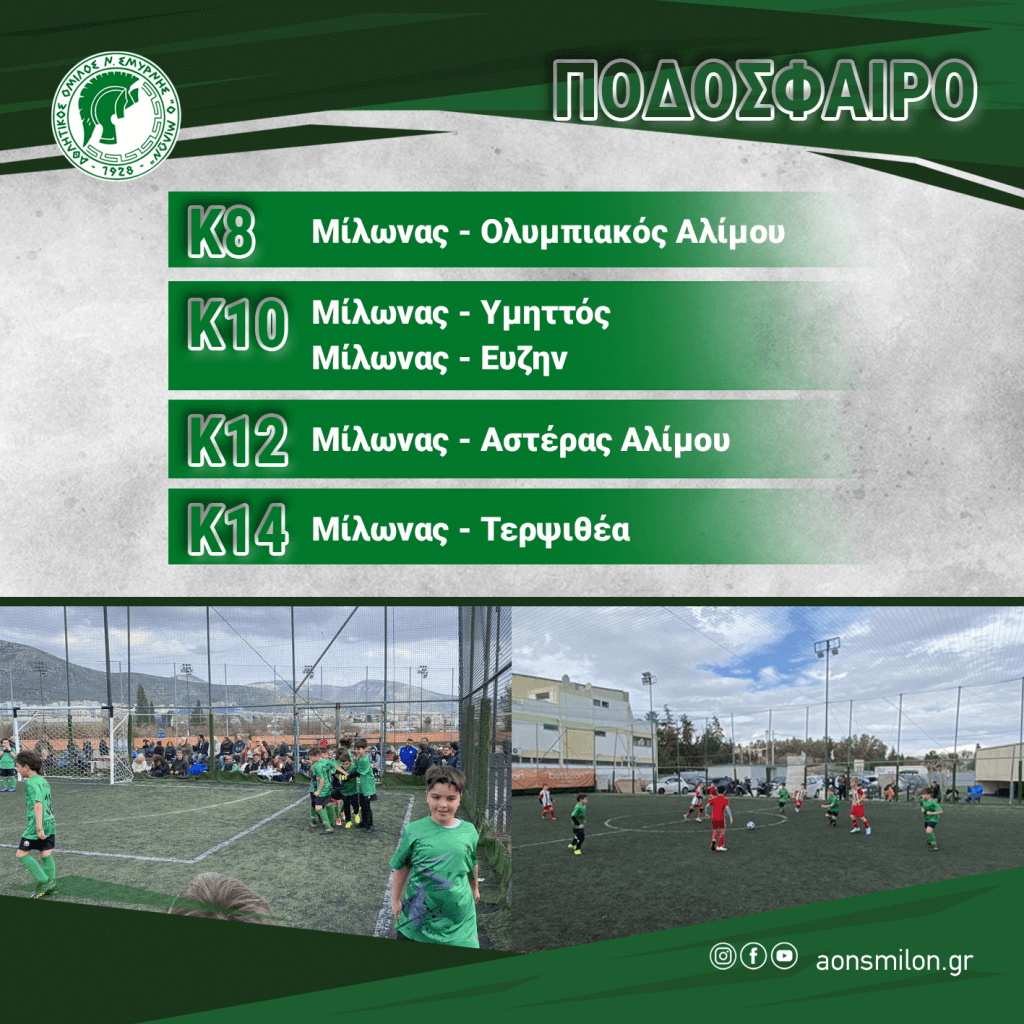 Κ12 • Μίλων – Coerver Κ12 ΣΑΛΑΣ • Μίλων – Ερυθρός Αστέρας Αθηνών K14 • Μίλων – AE Νέου Κόσμου