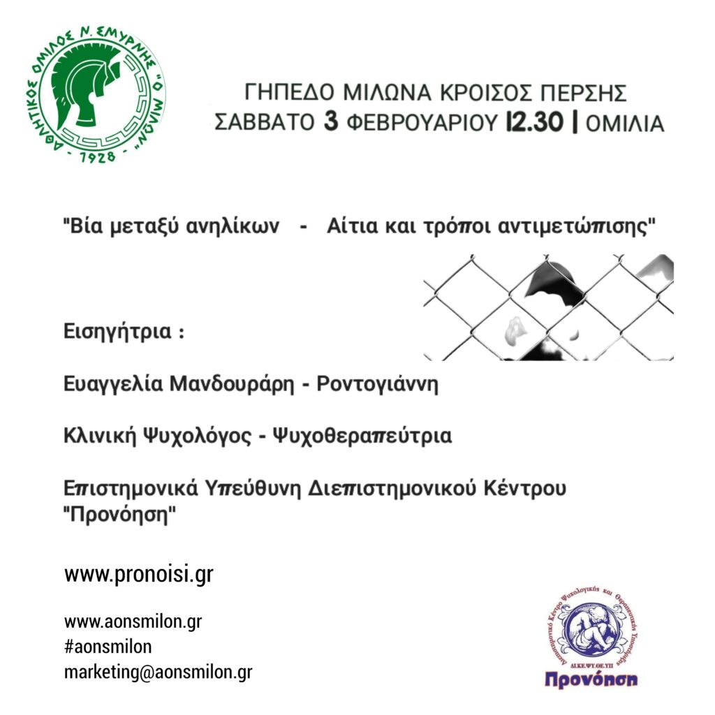 Το Σάββατο 3 Φεβρουαρίου στις 12.30 το πρωί στο κλειστό γήπεδο Κροίσος Πέρσης θα πραγματοποιηθεί ομιλία με θέμα : Βία μεταξύ ανηλίκων…