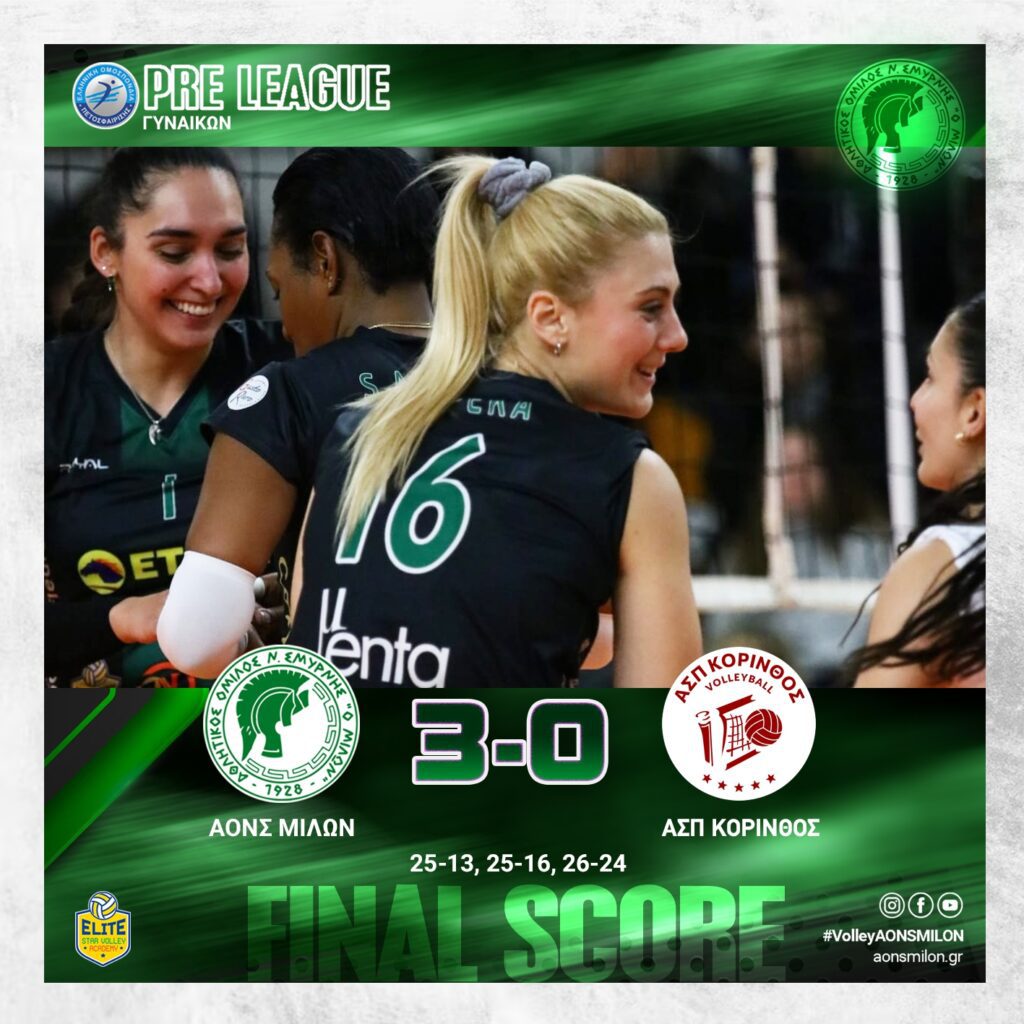 Α.Ο.Ν.Σ. Μίλων – Α.Σ.Π. Κορίνθου 3-0 (25-13, 25-16, 26-24) Διαιτητές: Τσίτσικας, Βλάχος, Παρατηρητής: Τσιμπινός. Α.Ο.Ν.Σ. ΜΙΛΩΝ (Γιώργος Δεναξάς): Αγγελοπούλου, Σάντος, Λουκά, Γκρέκα, Καρακύκλα,…